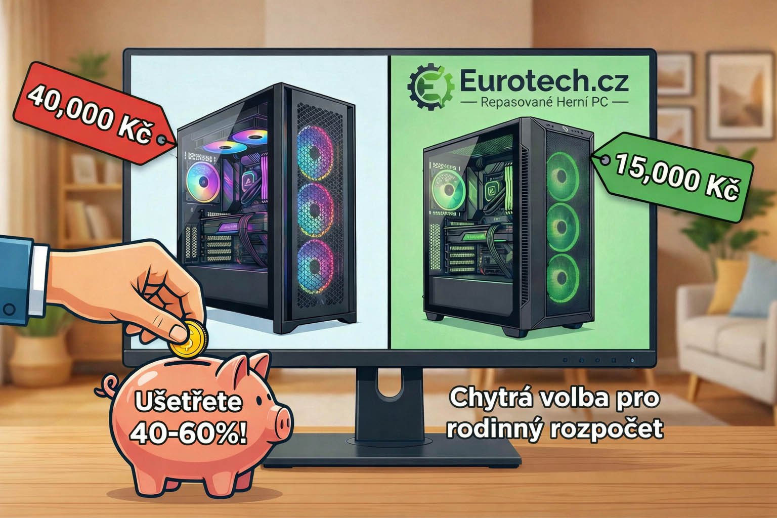 Výhodou nákupu na Eurotechu je, že získáte počítač, který jako nový stál desítky tisíc korun, za zlomek původní ceny. Pro rodinný rozpočet to znamená úsporu klidně 40–60 %, přičemž dítě rozdíl ve výkonu při hraní své oblíbené hry nepozná.
